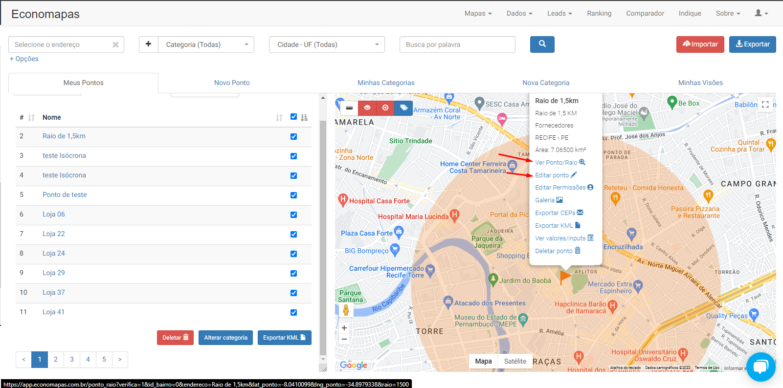 Com os seus pontos listados basta selecionar o ponto desejado e realizar a sua ação, seja ela apenas explorar o ponto realizar edições exportar os CEP's.