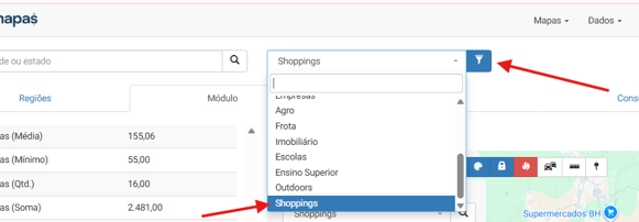 O Módulo Shoppings também conta com a busca avançada, que permite refinar a análise utilizando filtros como: