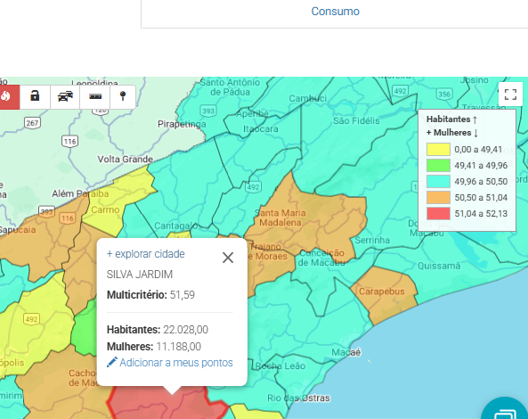 A ferramenta utiliza dados estatísticos para indicar, de forma visual, quais localidades são mais favoráveis para inserção de negócios, serviços ou prospecção de clientes, de acordo com os critérios definidos.