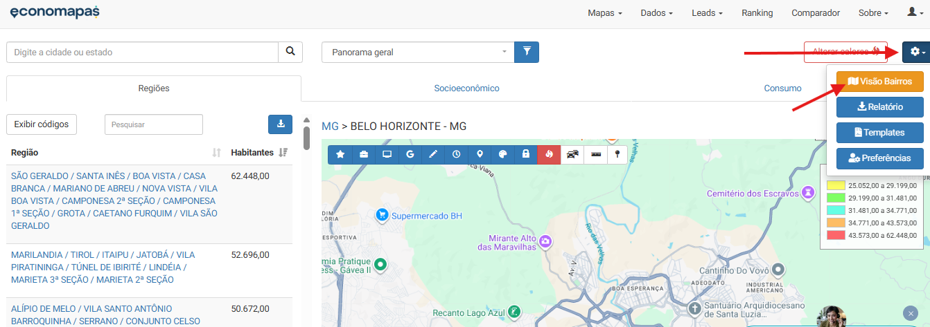 Ativação da funcionalidade: para usar a Visão Bairros, clique no ícone de engrenagem azul no canto superior direito da tela e selecione a opção “VISÃO BAIRROS”.