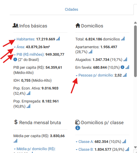 Informações básicas disponíveis: número de habitantes, IDH, PIB per capita, entre outros.