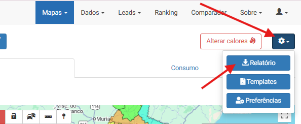 Para exportar o relatório, clique no ícone de relatório no canto superior direito e selecione a opção Relatório.